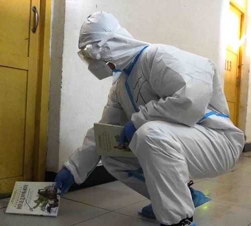 1月23日,在临西县第一中学负责的隔离点内,心理咨询师志愿者正在为被隔离学生送阅读的书籍(受访者供图)
