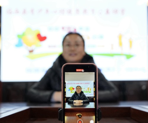 1月23日,临西县教育局心理健康教育与咨询中心的心理辅导教师正在录制心理健康视频,为集中隔离的孩子回家后的心理疏导做准备(受访者供图)