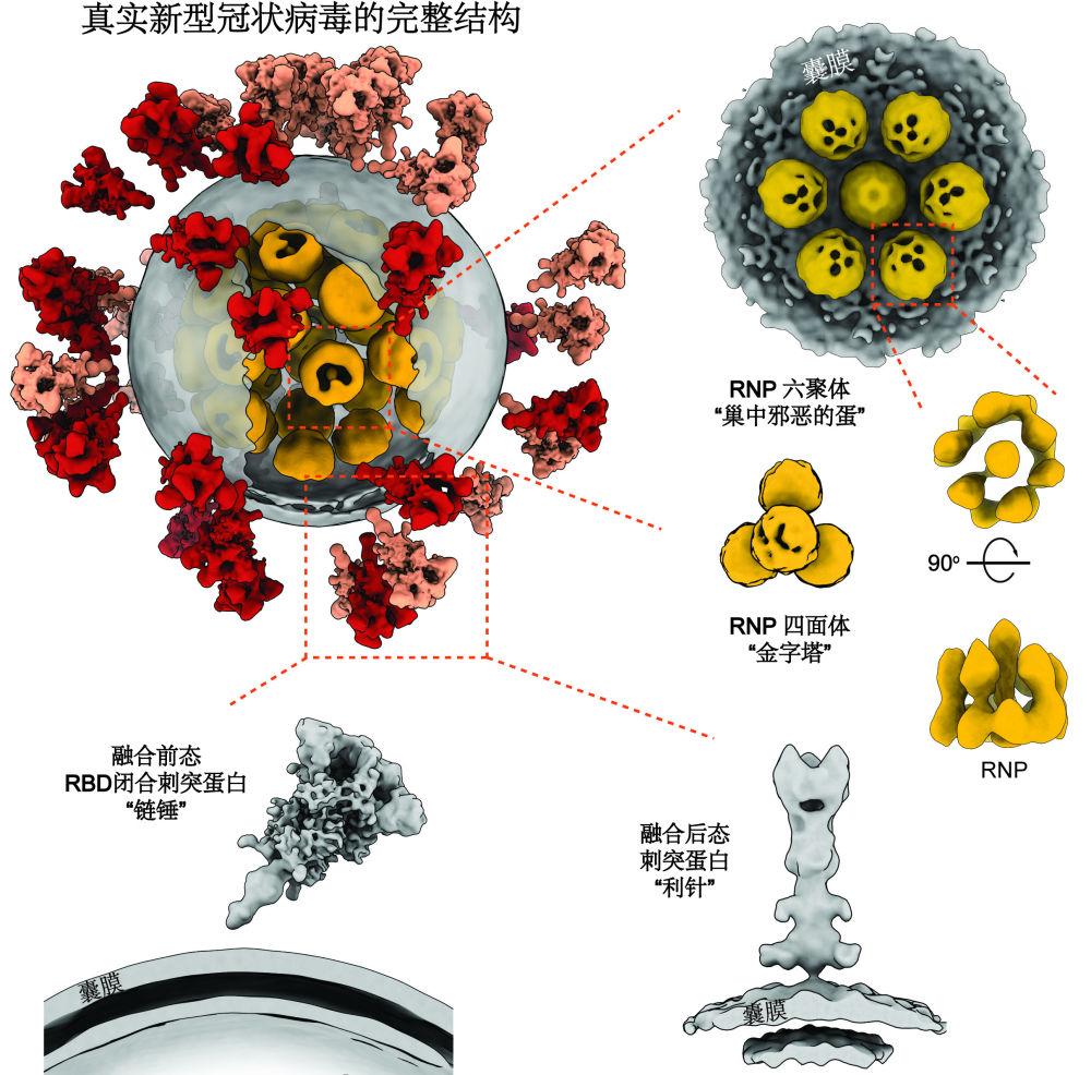 团队还向病毒内部“打手电”,穿过囊膜,清晰地照亮了病毒内部核糖核蛋白复合物的排列结构,展示出迄今为止最完整的新冠病毒形象。