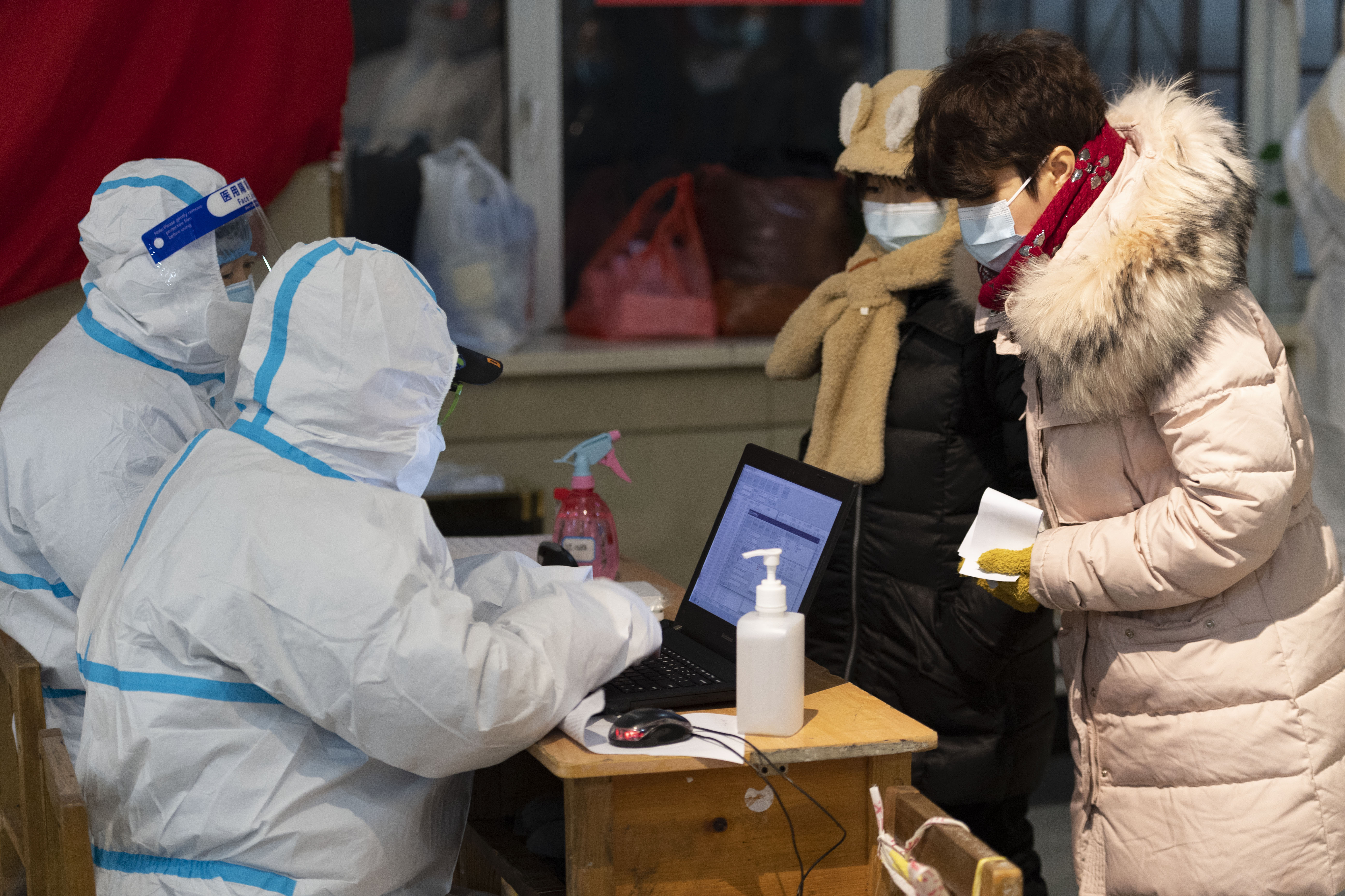 1月22日,在哈尔滨市第二职业高级中学,医务人员为市民登记身份信息。为应对当前新冠肺炎疫情,近日,黑龙江哈尔滨市开始有序组织市民进行核酸检测。新华社记者 谢剑飞 摄