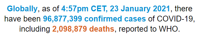 根据世卫组织最新实时统计数据,截至欧洲中部时间1月23日16时57分(北京时间1月23日23时57分),全球累计新冠肺炎确诊病例96877399例,累计死亡病例2098879例。23日全球新冠肺炎确诊病例新增600790例,死亡病例新增15846例。