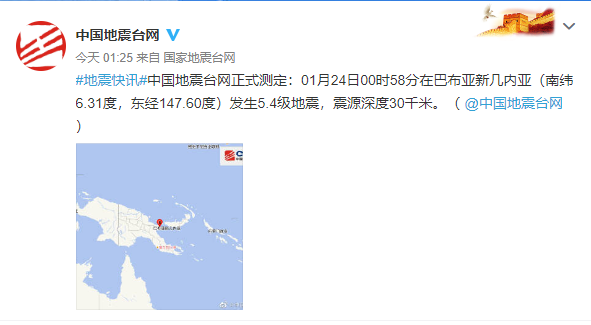 据中国地震台网正式测定:1月24日0时58分在巴布亚新几内亚(南纬6.31度,东经147.60度)发生5.4级地震,震源深度30千米。
