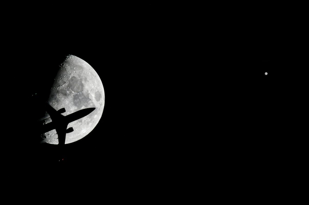 在墨西哥首都墨西哥城通过二次曝光拍摄的火星(右)和月亮。