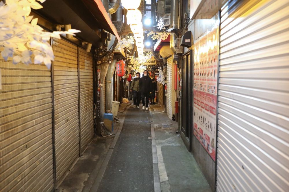1月22日,在日本东京新宿的一条街上,人们走过关闭的店铺。(新华社记者杜潇逸摄)