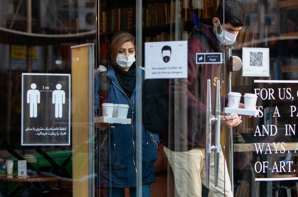 1月9日,在伊朗首都德黑兰,人们佩戴口罩走出咖啡馆。(新华社发,艾哈迈德·哈拉比萨斯摄)