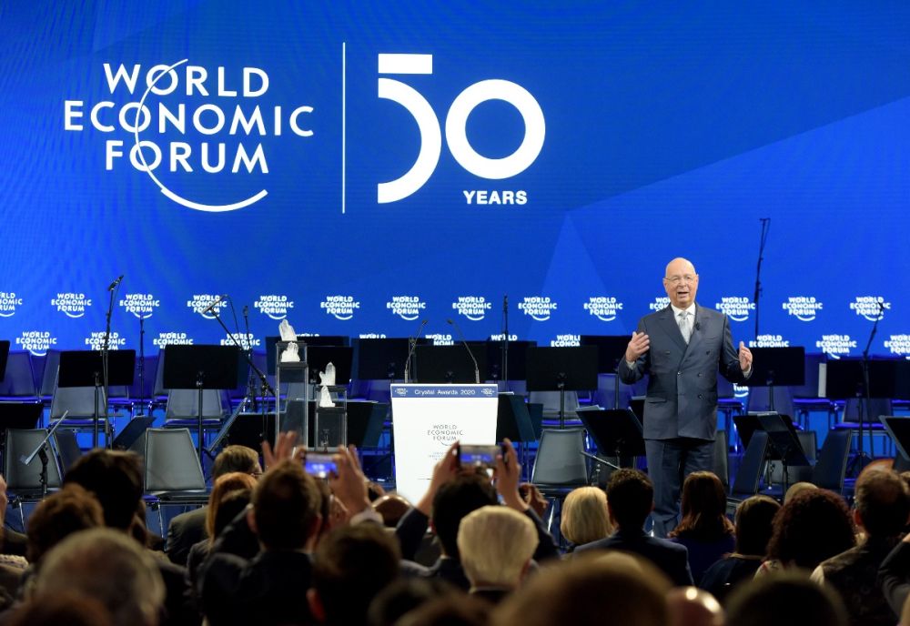 2020年1月20日,施瓦布在瑞士小镇达沃斯举行的世界经济论坛50周年庆祝活动中发表讲话。(新华社记者郭晨摄)