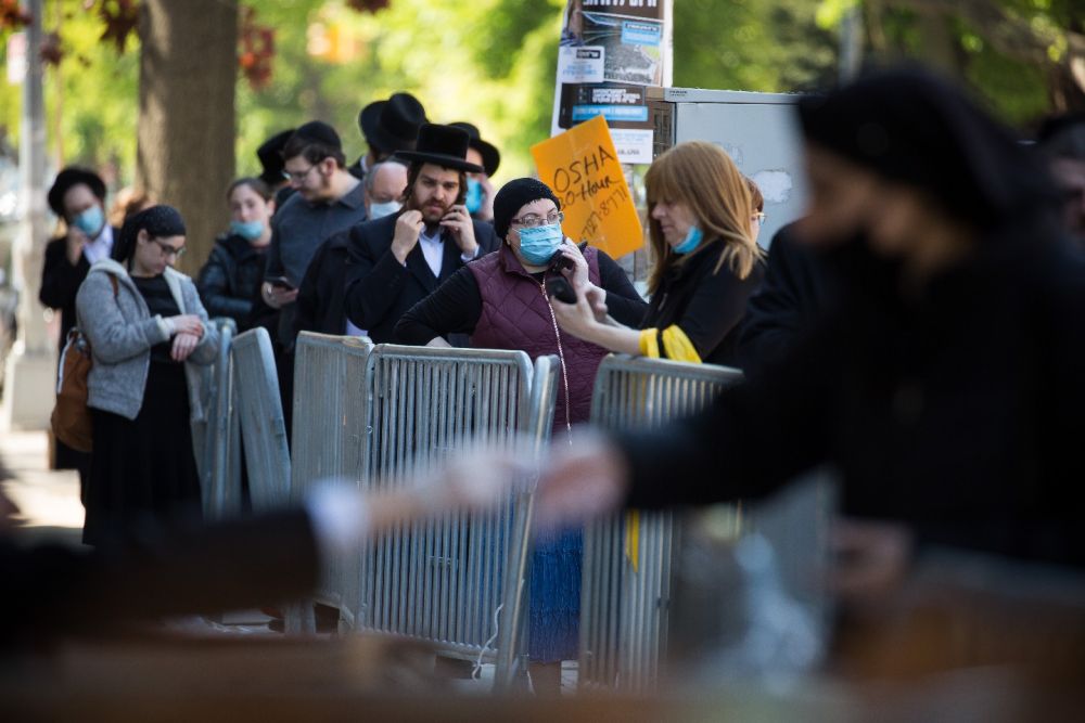 2020年5月14日,在美国纽约一个食品发放点,人们领取慈善组织发放的免费用餐券。新华社发(郭克摄)