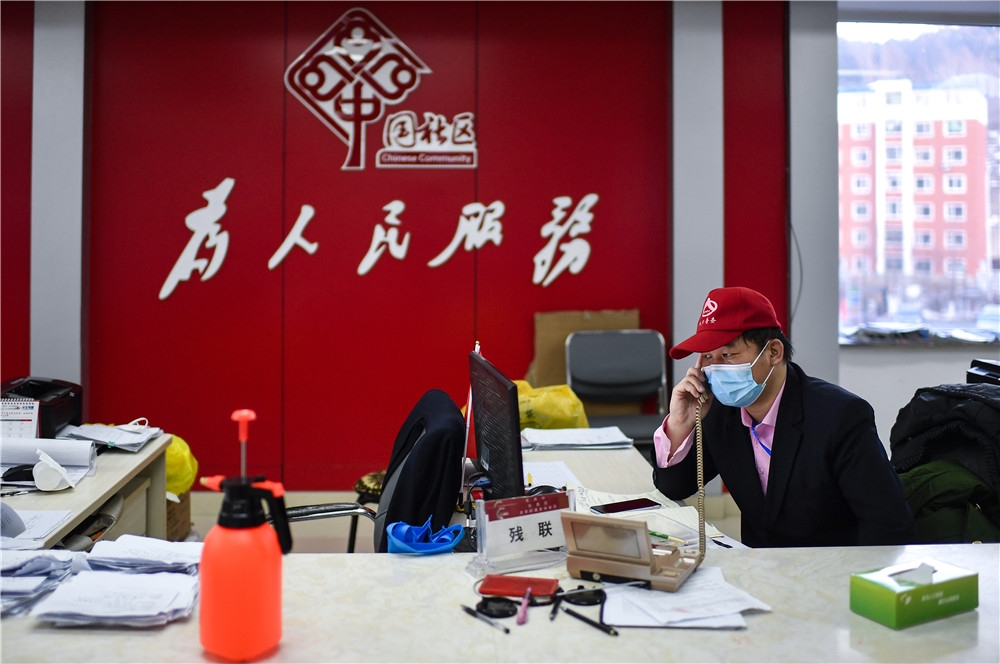 1月23日,在通化市东昌区龙泉街道龙水社区,工作人员在社区服务中心内接听居民电话,记录居民的诉求。新华社记者 许畅 摄