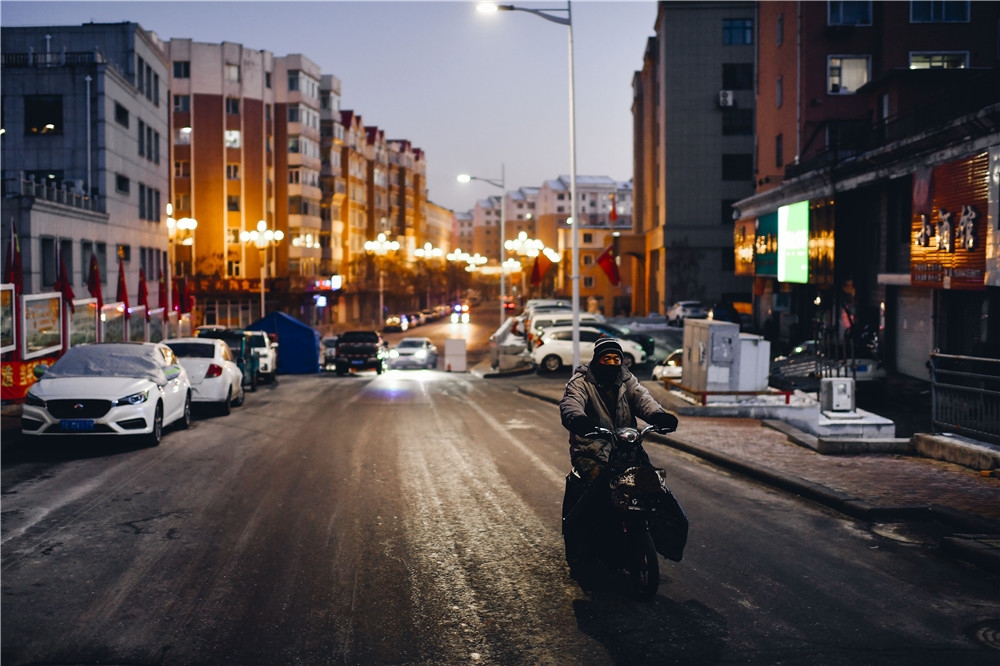 1月23日,通化市东昌区一位环卫工人结束当天工作后骑行在街道上。新华社记者 许畅 摄