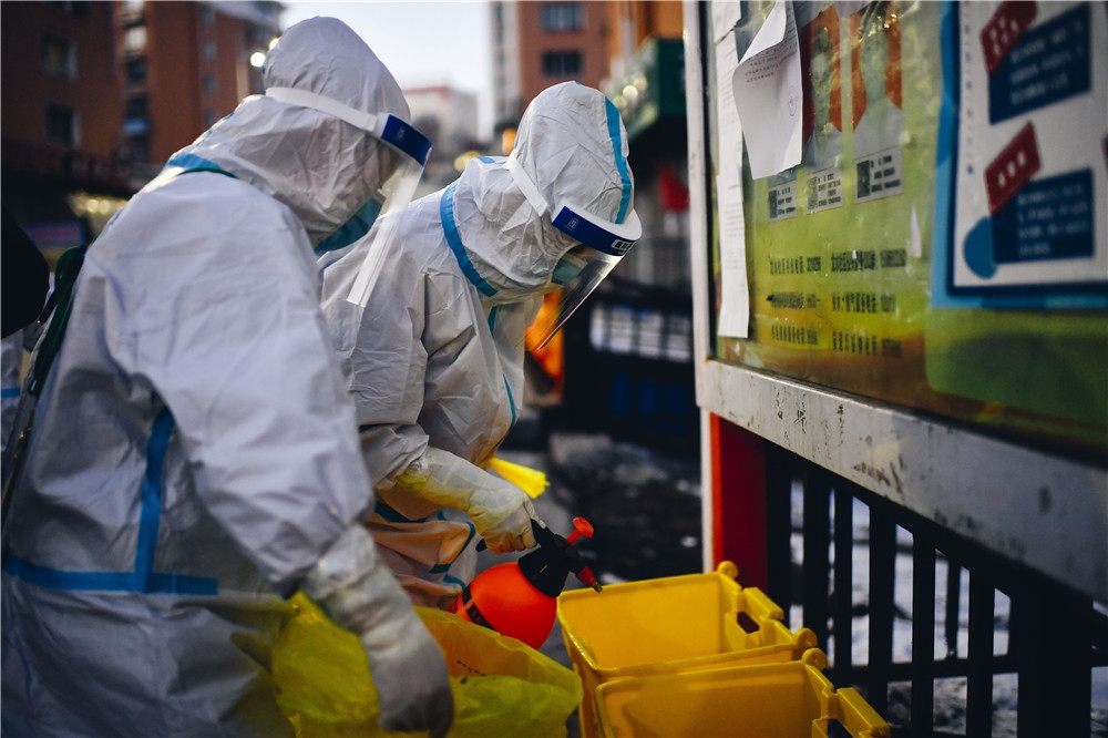 1月23日,在通化市东昌区龙泉街道龙水社区,防疫人员对医疗废物垃圾箱进行消毒。新华社记者 许畅 摄
