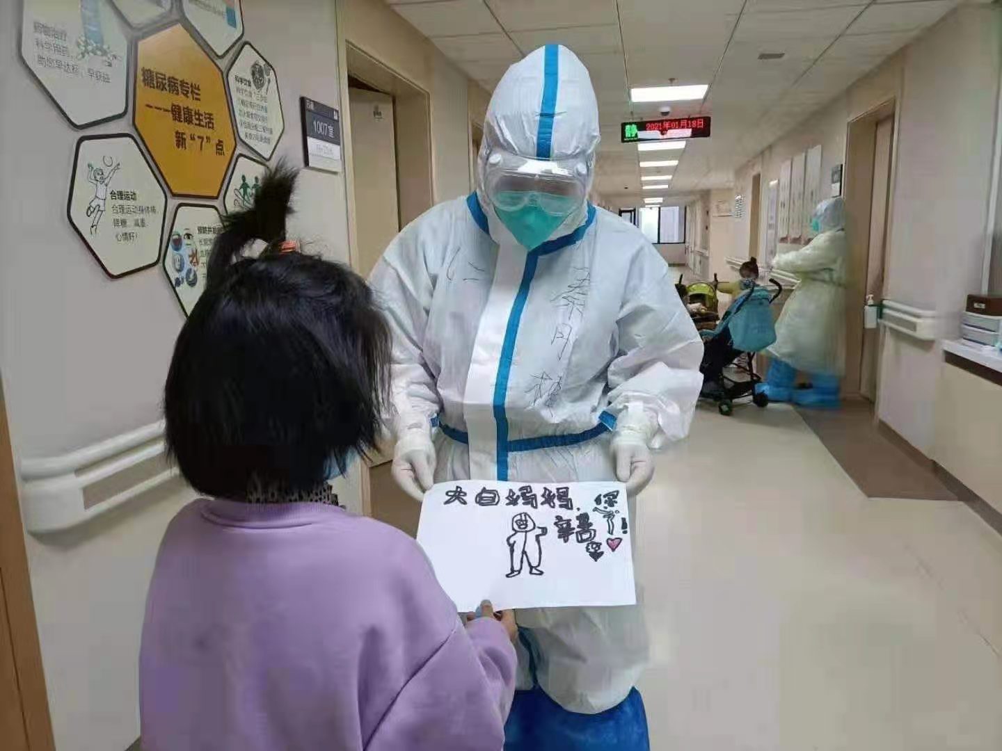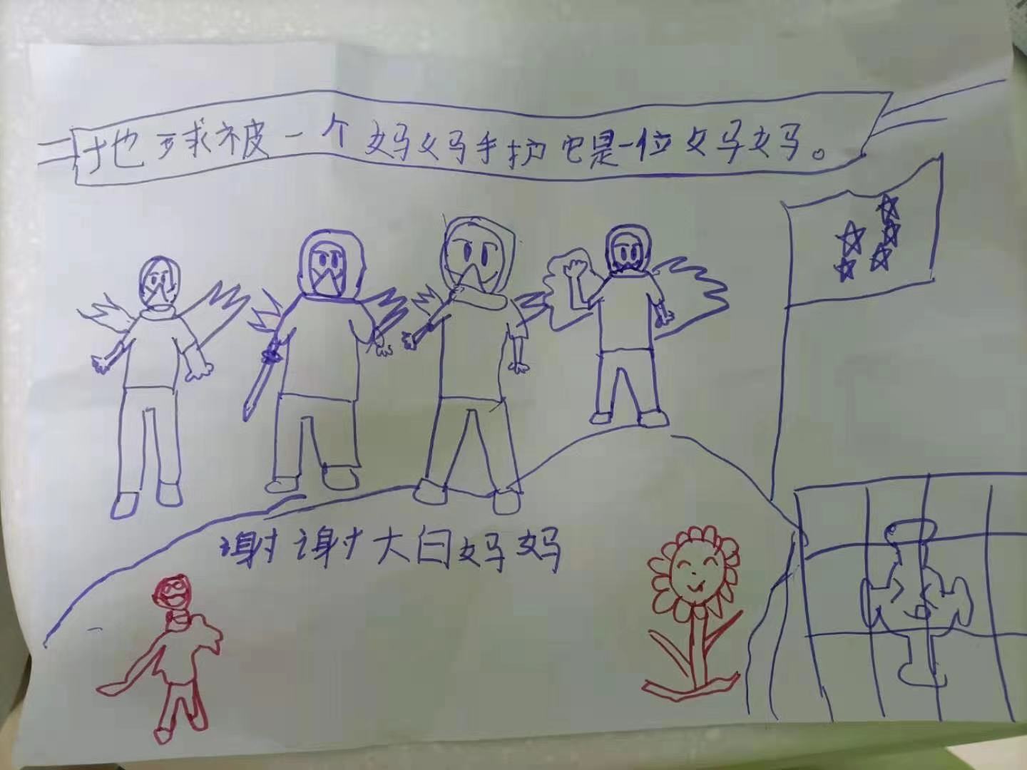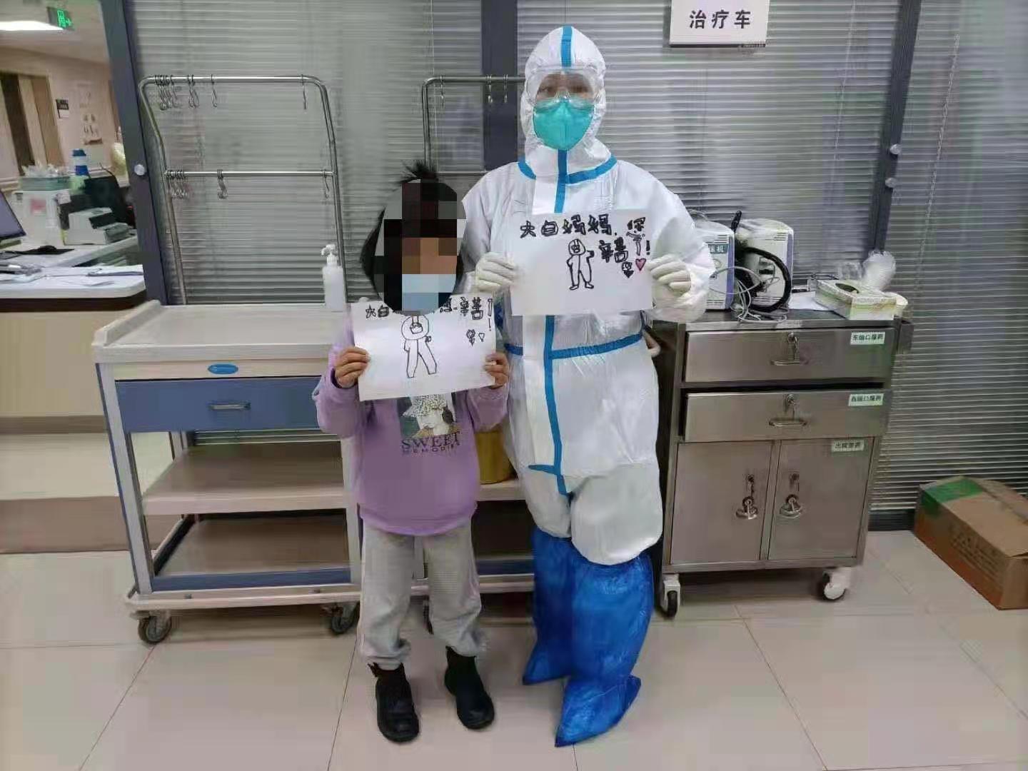 我叫袁佳佳,是河北省武安市第一人民医院儿科护士,1月23日是被派到石家庄市人民医院新冠肺炎儿童患者病区的第10天。这一天,同事转给我们孩子画的一张给“大白妈妈”的照片,我后来才知道,大白是动画片里的角色,是一个可以治愈人和保护人的“超常机器人”。