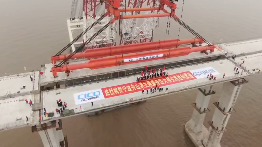 1月24日上午,在东海的万顷碧波中,随着一片重达1800多吨的70米箱梁被海上大型浮吊缓缓地放在舟岱大桥主通航孔北边跨处的高墩上,标志着宁波舟山港主通道项目实现主线贯通。