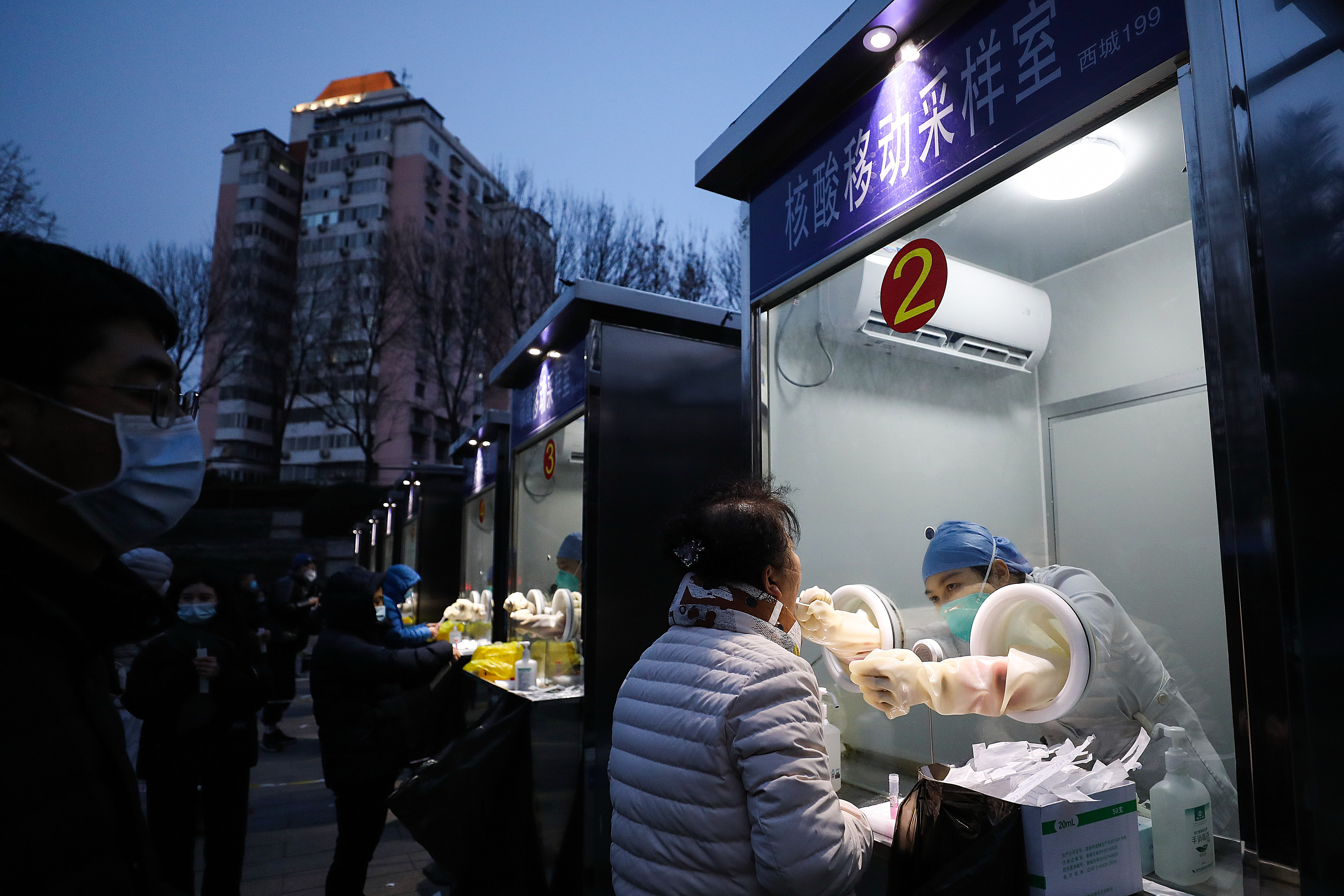 1月22日,在位于北京市西城区广外街道的一处临时核酸检测采样点,来自中国中医科学院广安门医院的医护人员为被检测人员采集核酸样本(新华社记者张玉薇摄)