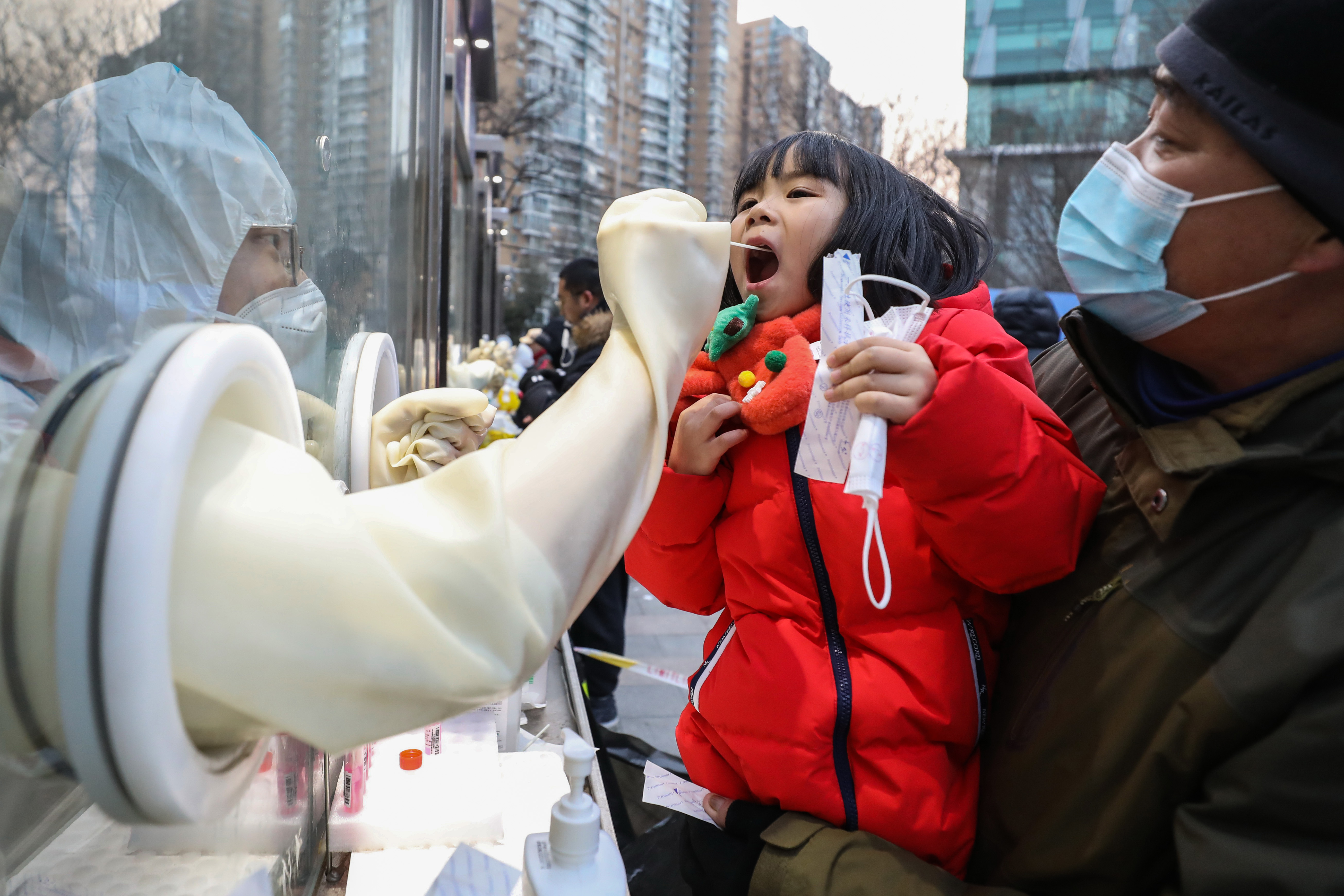 1月22日,在位于北京市西城区广外街道的一处临时核酸检测采样点,来自中国中医科学院广安门医院的医护人员为一名小朋友采集核酸样本(新华社记者张玉薇摄)