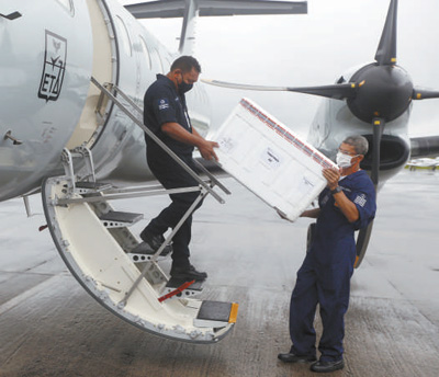巴西空军将中国新冠疫苗运至亚马孙州塔巴廷加市,工作人员正在搬运疫苗。