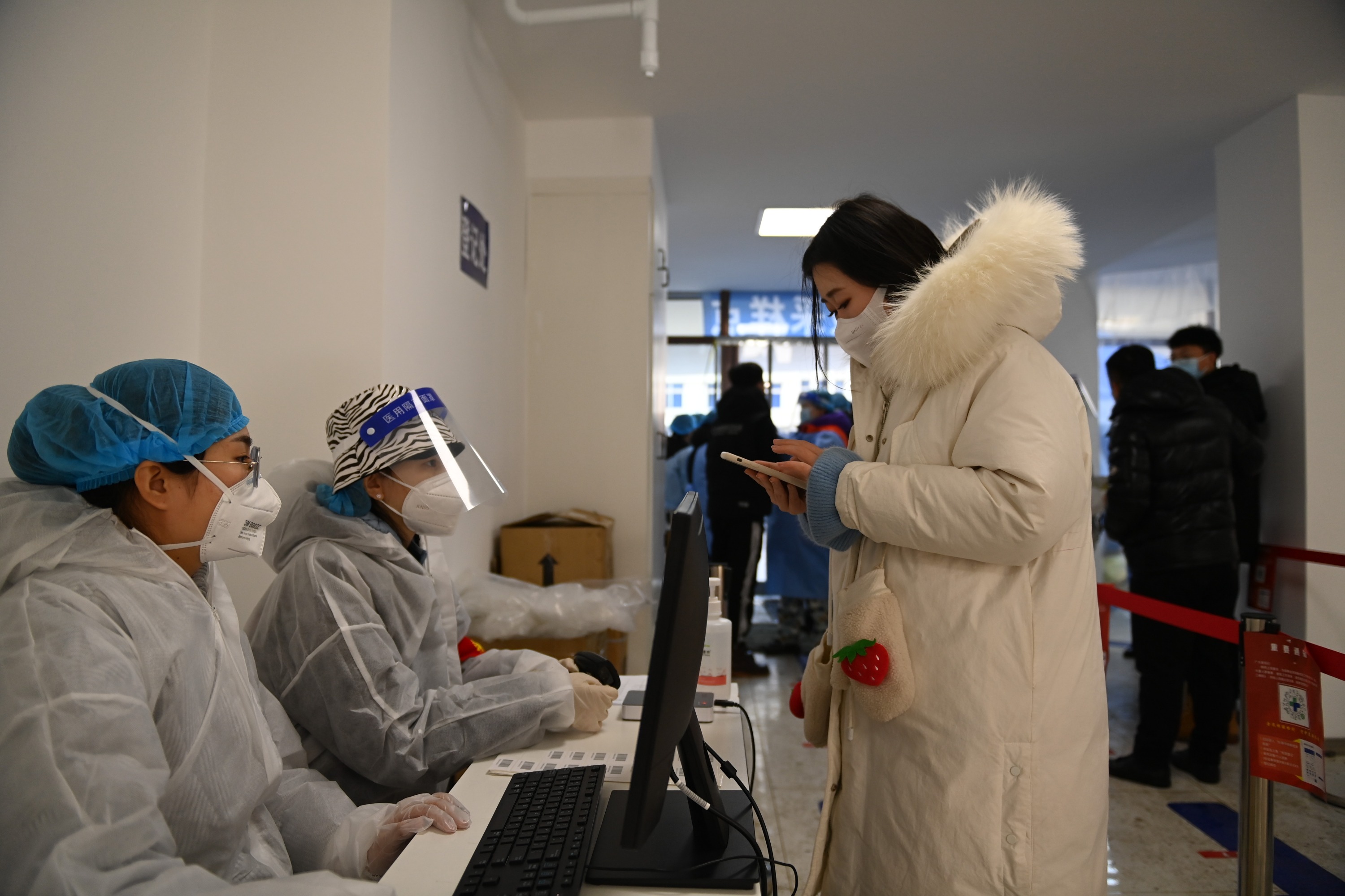 ↑志愿者王翀(左二)正在为检测居民扫码登记。新华社记者 颜麟蕴 摄