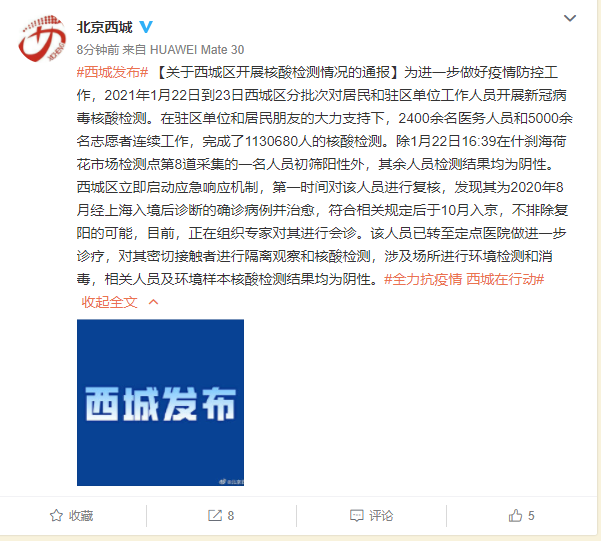 【关于西城区开展核酸检测情况的通报】为进一步做好疫情防控工作,2021年1月22日到23日西城区分批次对居民和驻区单位工作人员开展新冠病毒核酸检测。在驻区单位和居民朋友的大力支持下,2400余名医务人员和5000余名志愿者连续工作,完成了1130680人的核酸检测。除1月22日16:39在什刹海荷花市场检测点第8道采集的一名人员初筛阳性外,其余人员检测结果均为阴性。