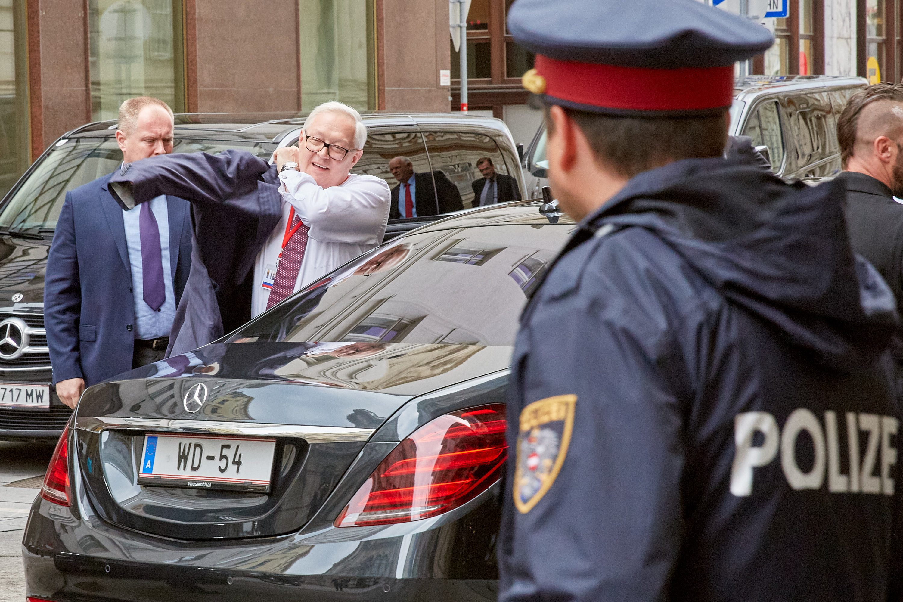 2020年6月22日,俄罗斯副外长里亚布科夫(左二)抵达位于奥地利维也纳的下奥地利宫参加美俄军控对话。(新华社发,乔治斯·施耐德摄)