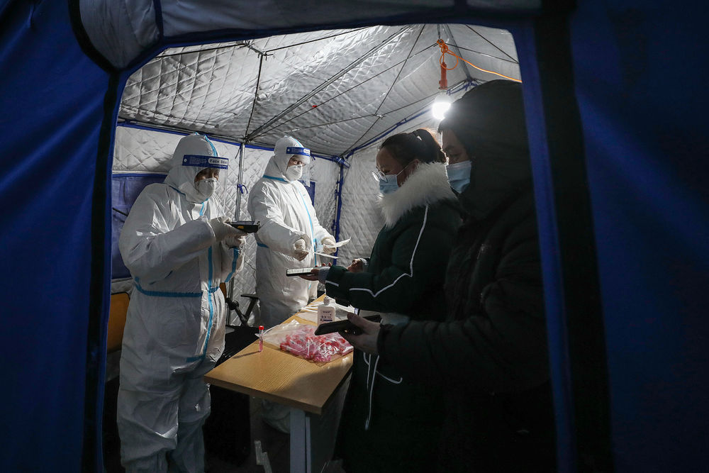 1月22日,在位于北京市西城区广外街道的一处临时核酸检测采样点,工作人员为被检测人员登记(新华社记者张玉薇摄)