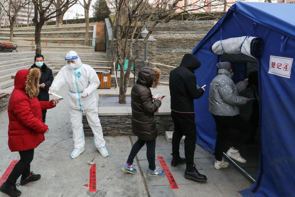 1月22日,在位于北京市西城区广外街道的一处临时核酸检测采样点,工作人员引导被检测人员进行登记(新华社记者张玉薇摄)