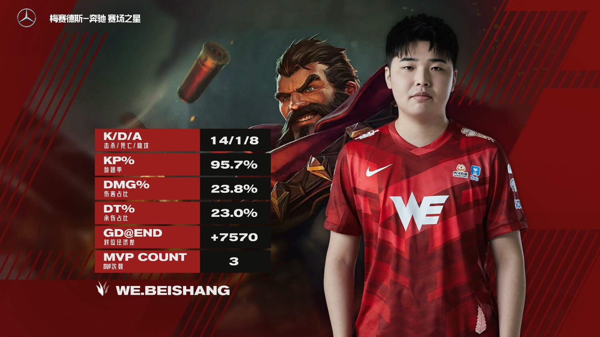 首局比赛双方势均力敌,WE后期凭借团战的胜利拿下“火龙魂”和“纳什男爵”,打破比赛的平衡,1:0先下一城。第二局WE打野姜志鹏(ID: beishang)使用“男枪”格雷福斯很好地掌控了比赛节奏,以14杀1死8助攻的出色表现带领队伍乘胜追击,横扫对手。