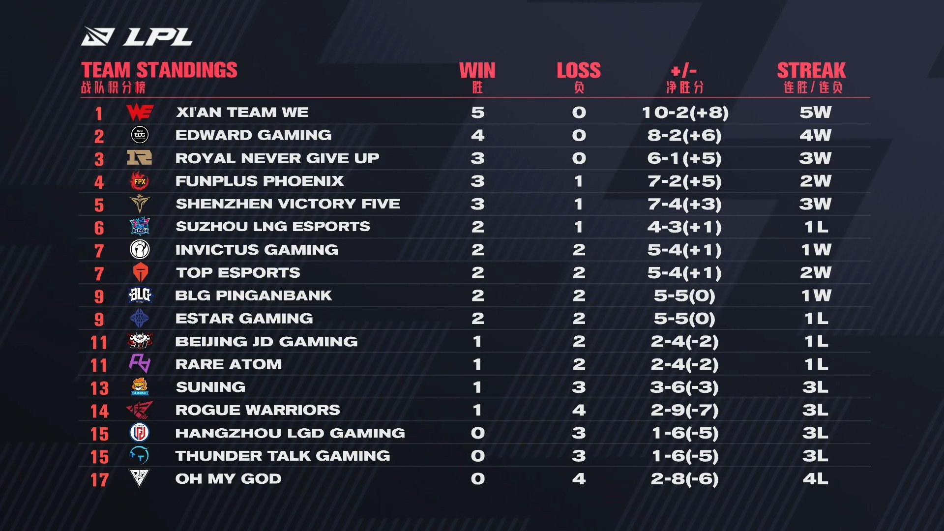 经过本周的比赛,被粉丝亲切地称为“御三家”的WE、EDG和RNG三支战队均保持不败,位列积分榜一至三名,LGD、TT和OMG则至今难求一胜。
