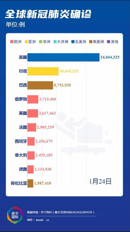 美国约翰斯·霍普金斯大学:截至北京时间25日6时22分,全球新冠确诊病例达99131815例,死亡病例为2127206例。美国是全球疫情最严重的国家,确诊病例达25109148例,死亡病例为418982例。