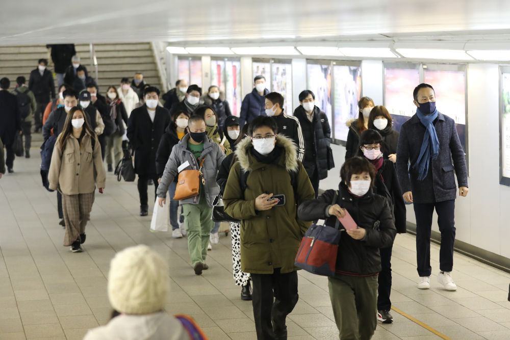 1月22日,在日本东京新宿车站,人们戴口罩出行。(新华社记者杜潇逸摄)