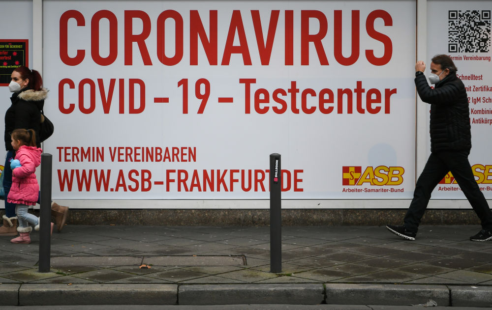 1月20日,在德国法兰克福,戴口罩的行人从一处新冠病毒检测中心外经过。(新华社记者逯阳摄)