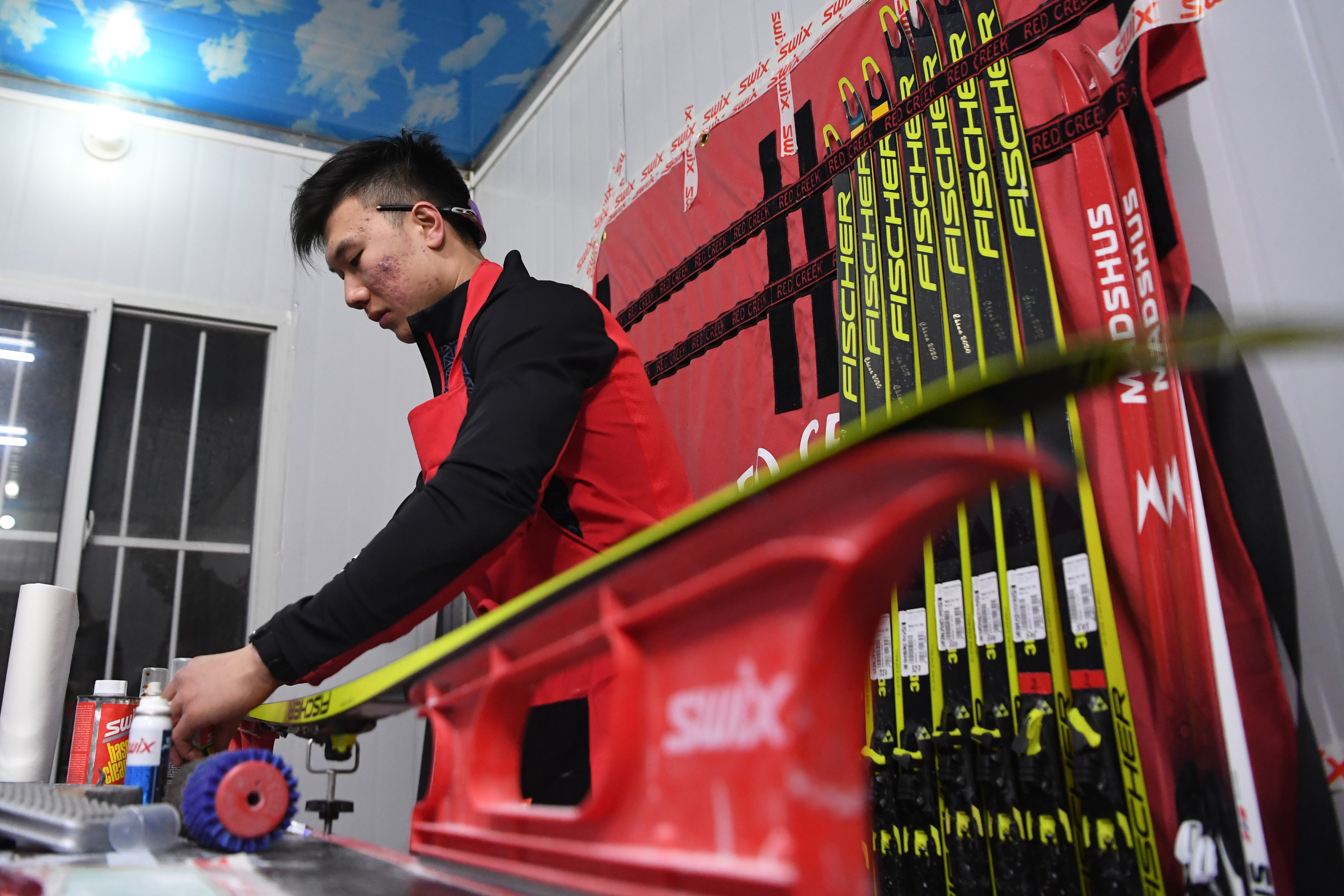 夜深了,结束一天比赛的运动员已经入睡。滑雪场旁边的打蜡房里,灯还亮着,王一涵和王啸还在忙碌,明天还有比赛,他们还有任务,并心怀期待。