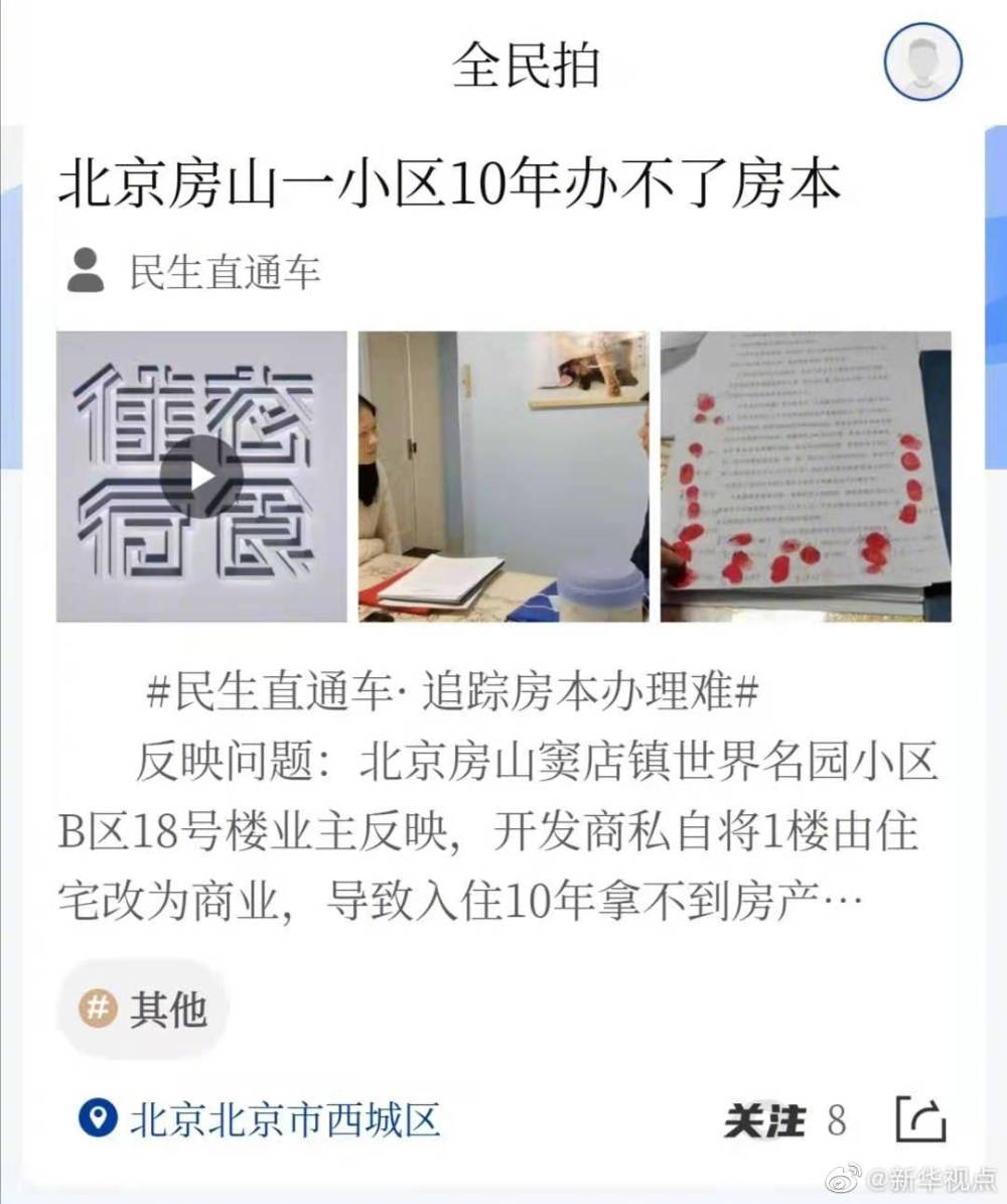 【北京房山一小区10年办不了房本】北京房山窦店镇世界名园小区B区18号楼业主反映,开发商私自将1楼由住宅改为商业,导致入住10年拿不到房产证。记者调查发现,2018年4月,房山区法院判开发公司“于2018年12月31日前办理房屋所有权证”,但至今没有下文。窦店镇政府、房山区住建委有关负责人对记者表示“不便接受当面采访”,正“协调推进解决问题”。
