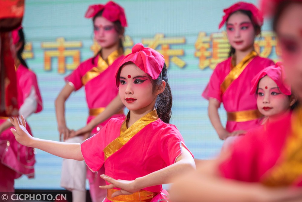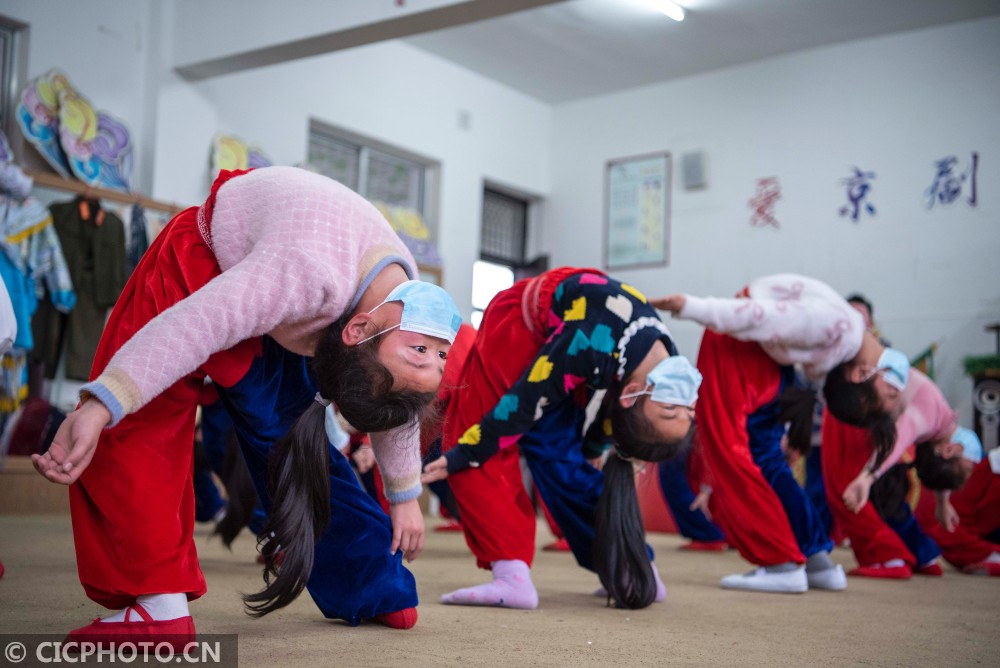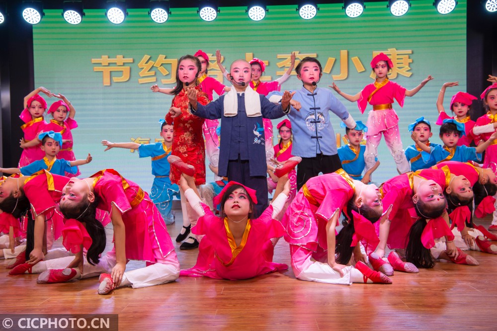 ↑2021年1月23日,在江苏南通海安市城东镇西场小学,同学们在表演京剧节目《节约路上奔小康》。CICPHOTO/徐劲柏 摄