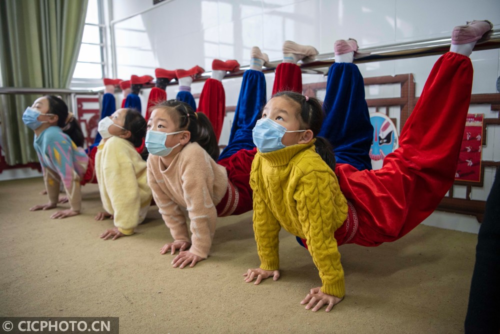 ↑2021年1月23日,在江苏南通海安市城东镇西场小学,学生在练习控腰。CICPHOTO/徐劲柏 摄