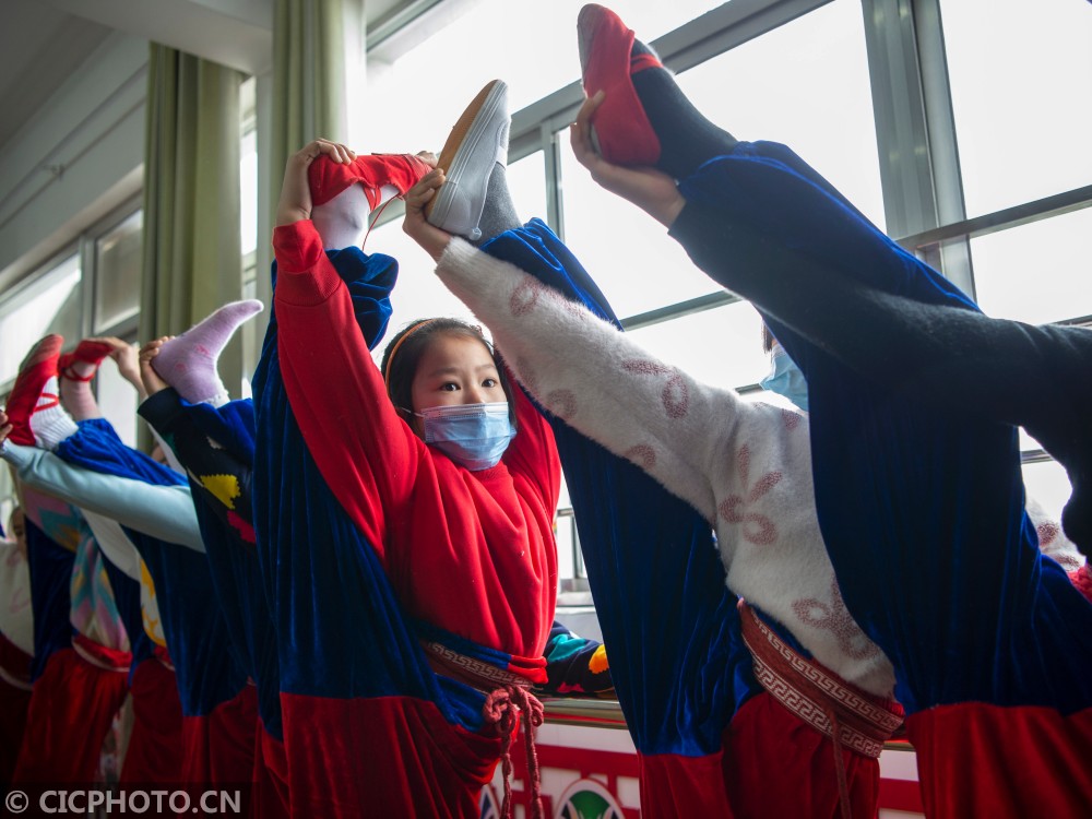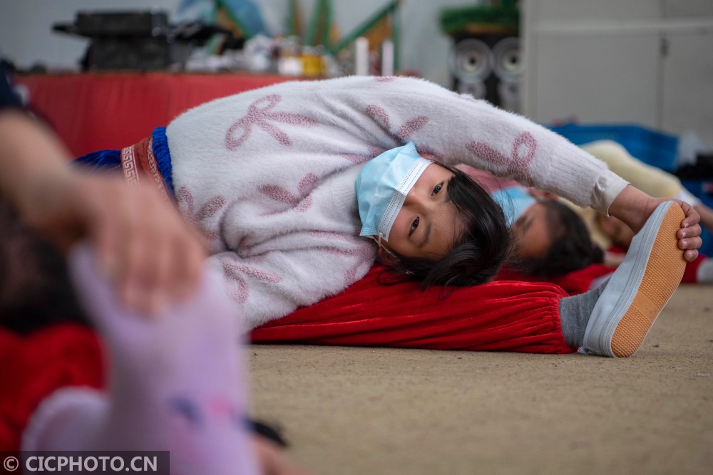 ↑2021年1月23日,在江苏南通海安市城东镇西场小学,学生在练习扳腿。CICPHOTO/徐劲柏 摄