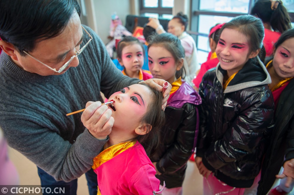 ↑2021年1月23日,在江苏南通海安市城东镇西场小学,老师在给学生上妆。CICPHOTO/徐劲柏 摄