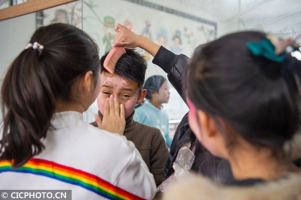 ↑2021年1月23日,在江苏南通海安市城东镇西场小学,几名学生在化妆间隙玩耍。CICPHOTO/徐劲柏 摄