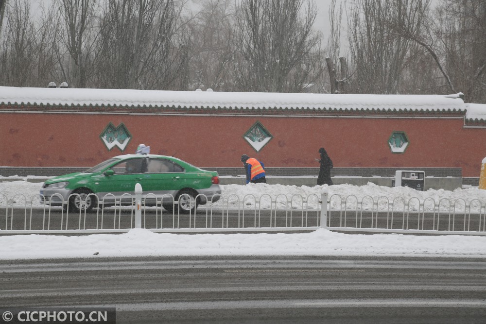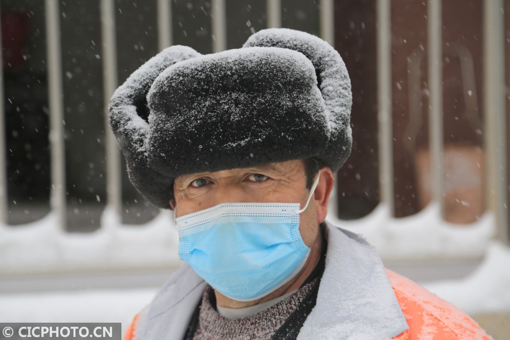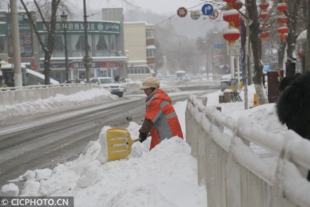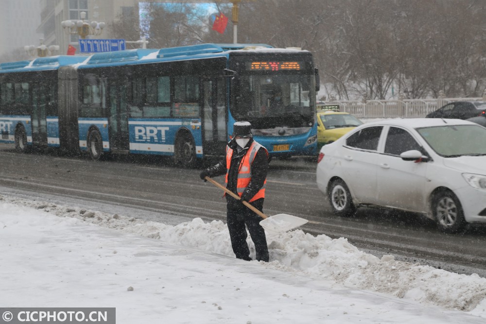 以上图片:新疆乌鲁木齐市环卫工人在街上清理积雪。CICPHOTO/邹建奇 摄