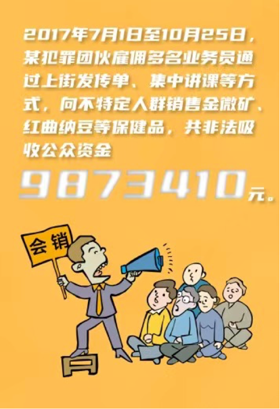 搜索中发现,涉案金额之巨也令人触目惊心。例如,2017年7月1日至10月25日,某犯罪团伙通过雇佣多名业务员通过上街发传单、集中讲课等方式,公开宣传以高额利息为诱饵,向不特定人群以高于进价二十倍的价格销售铁皮石斛、金微矿、黄氏太子参、羊初乳、红曲纳豆等保健品,在短短三个多月里,就非法吸收公众资金9873410元。