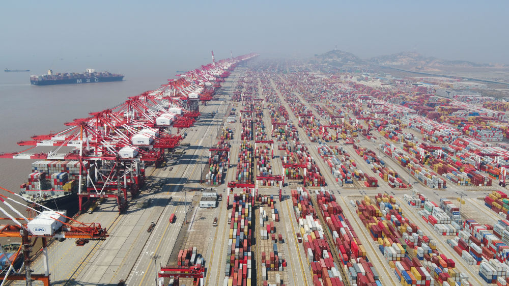 2020年3月18日拍摄的上海洋山港集装箱码头(无人机照片)。(新华社记者丁汀摄)