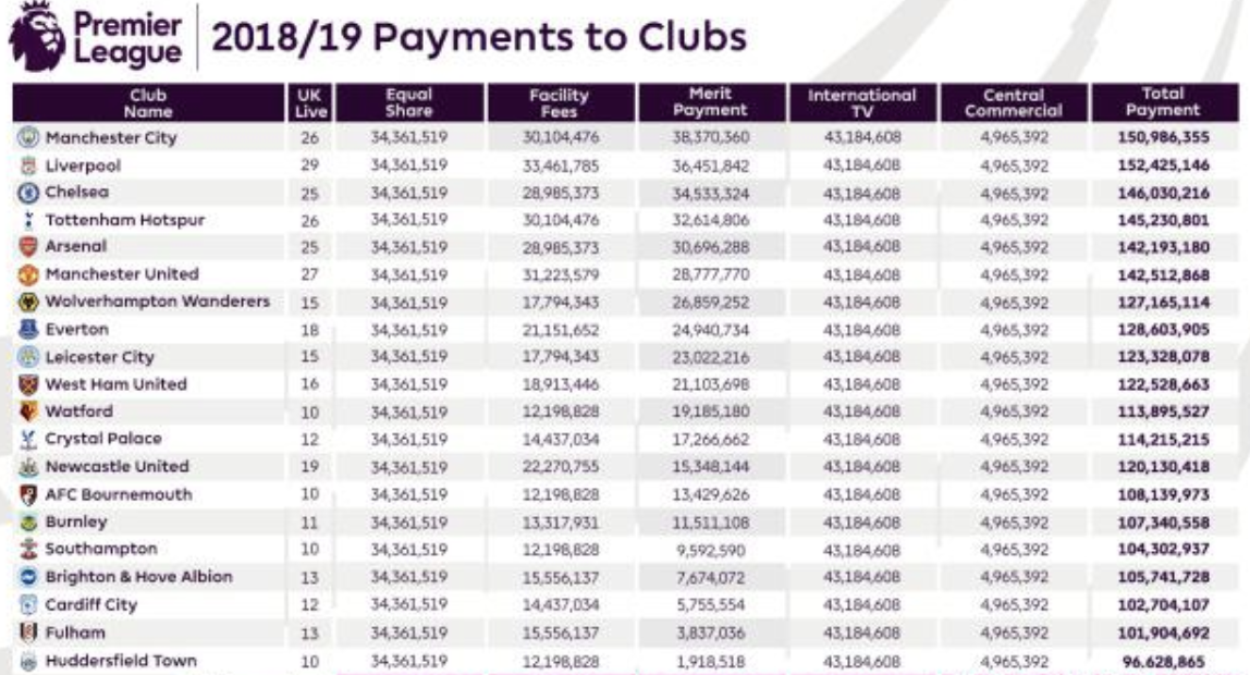 最后一位的哈德斯菲尔德拿到了约9700万英镑
