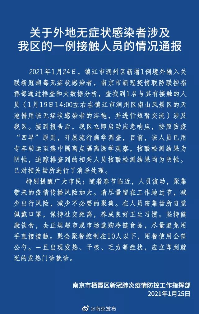 2021年1月24日,镇江市润州区新增1例境外输入关联新冠病毒无症状感染者,南京市新冠疫情联防联控指挥部通过排查和大数据分析,查找到1名与其有接触的人员(1月19日14:00左右在镇江市润州区南山风景区的天池借用该无症状感染者的浴袍,并进行短暂交流)涉及栖霞区。接到报告后,栖霞区立即启动应急响应,按照防疫“四早”原则,开展流行病学调查,目前,该人员已用专车转运至集中隔离点隔离医学观察,核酸检测结果为阴性,追踪排查到的相关人员核酸检测结果均为阴性。已对相关场所进行了消杀处理。