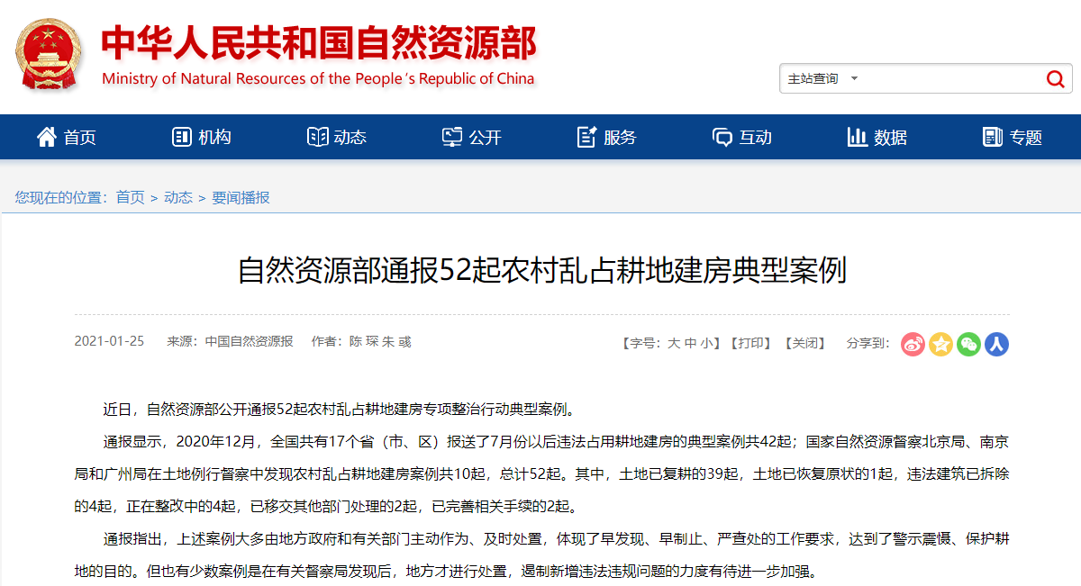 为进一步严格耕地保护,维护国家粮食安全。今天(1月25日),自然资源部公开通报52起农村乱占耕地建房专项整治行动典型案例。