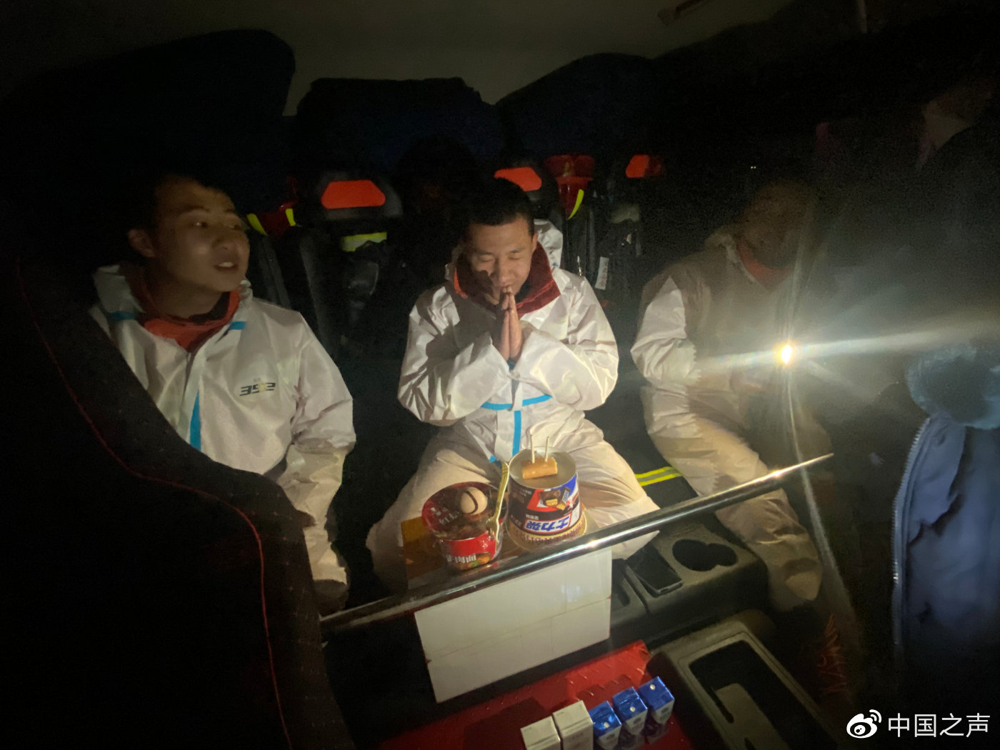 △值守期间,一名队友过生日,蜡烛使用一次性筷子做的,小面包代替了生日蛋糕,方便面成了长寿面