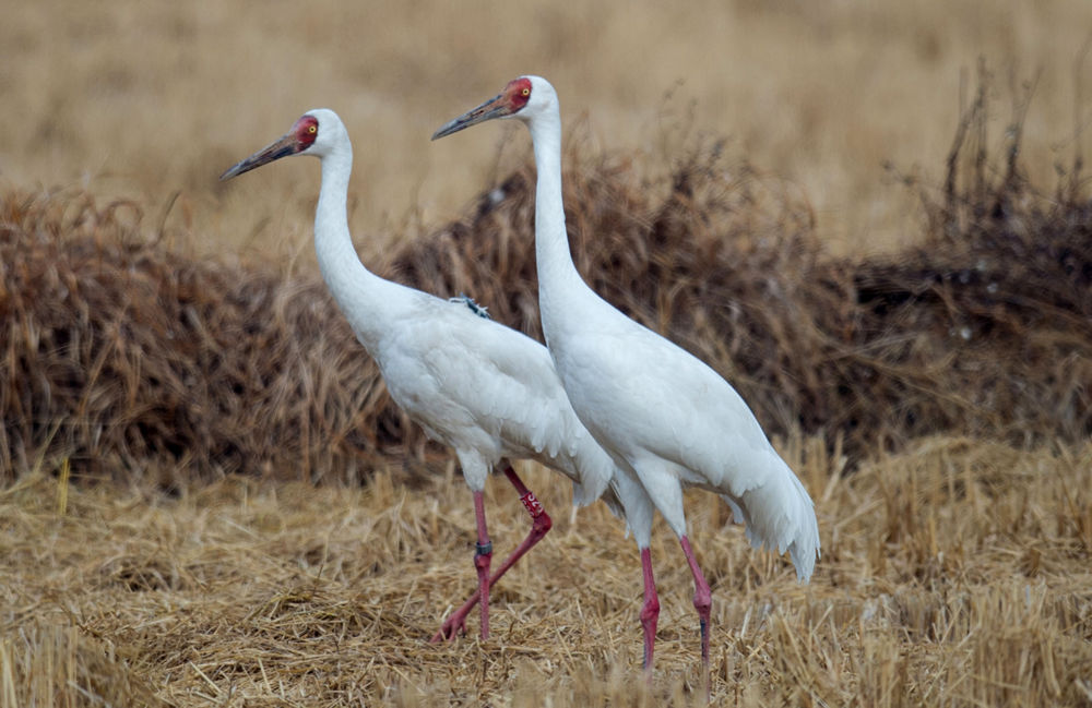 这是一名摄影师在山东黄河三角洲保护区拍摄到的白鹤“爱爱”(左),它的腿部带有“S26”的环志(2018年12月22日摄)。