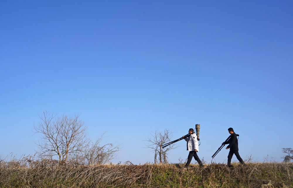 在江西省余干县康山垦殖场,汪志如(左)与况绍祥扛着观测设备准备准备观测和拍摄白鹤(1月18日摄)。