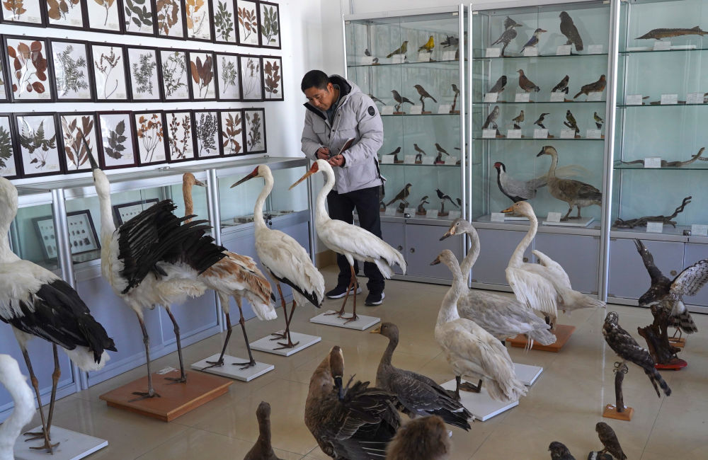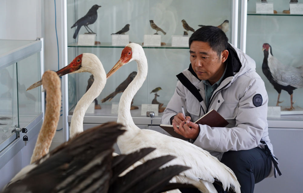 在江西省野生动植物救护繁育中心,汪志如在研究白鹤标本(1月18日摄)。