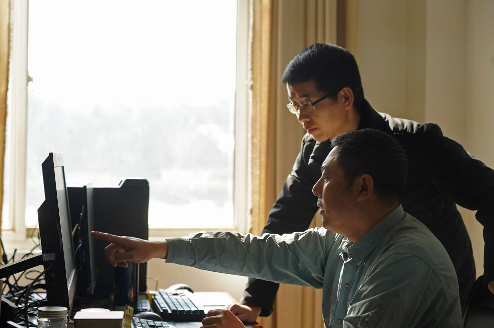 在江西省野生动植物救护繁育中心,汪志如(前)与况绍祥用跟踪系统查看白鹤“爱爱”失联时的信号定位(1月18日摄)。