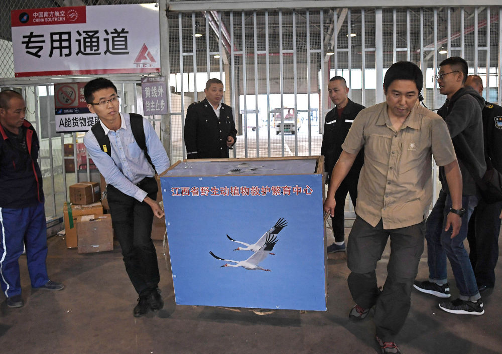 江西省野生动植物救护繁育中心的汪志如(前右)与况绍祥(前左)将白鹤“爱爱”运抵长春龙嘉机场(2018年5月7日摄)。