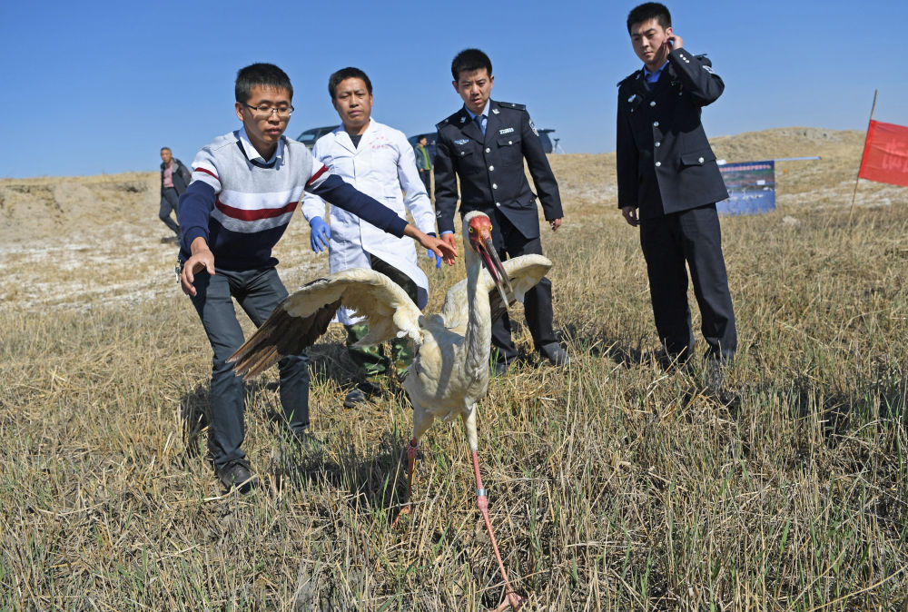 在吉林省莫莫格国家级自然保护区,工作人员为即将放飞的白鹤“爱爱”安装环志(2018年5月8日摄)。