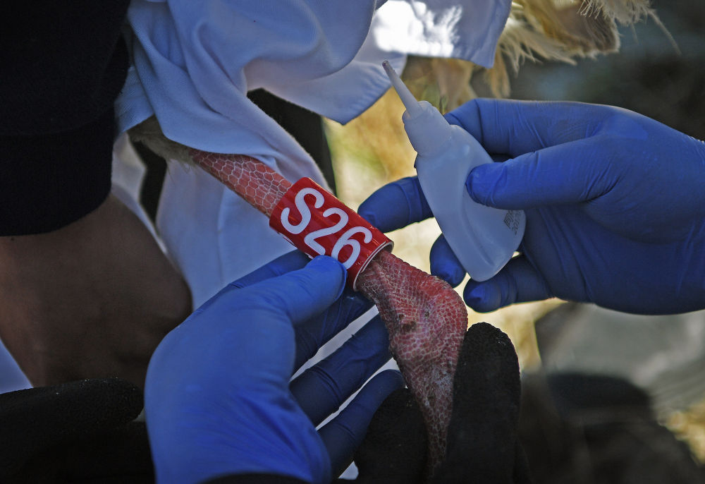 在江西省野生动植物救护繁育中心,工作人员一边为白鹤“爱爱”安装鸟类追踪器,一边轻轻抚摸它的身体,让它平静下来(2018年5月4日摄)。